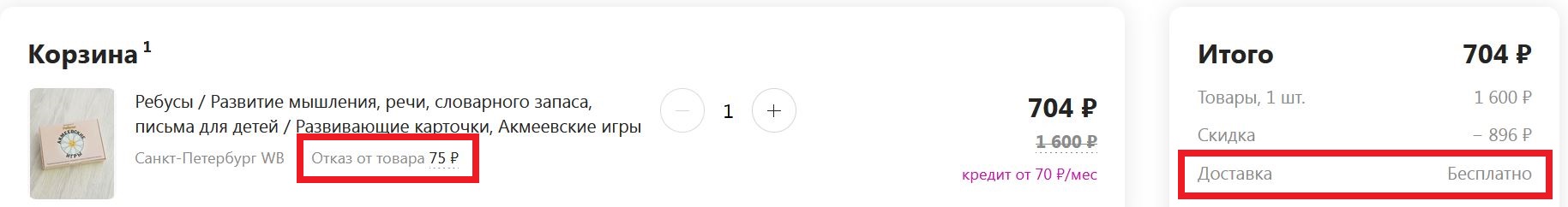 Сумму за возврат (75 руб) убрали из корзины...