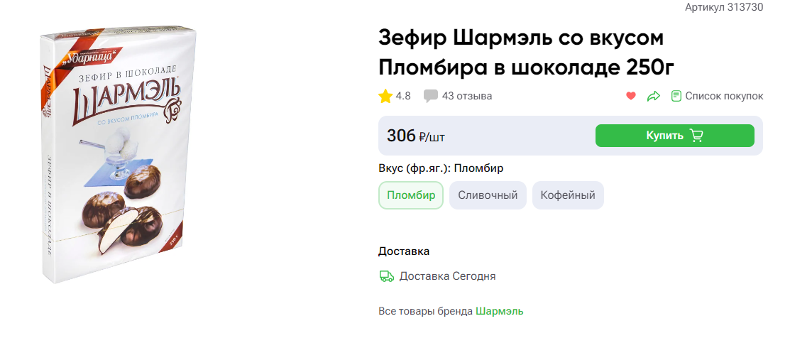 В перекрестке 411 классика стоит... https://www.vprok.ru/product/sharmel-sharmel-zefir-klass-v-shokol250g--304599?searchPhrase=шармель