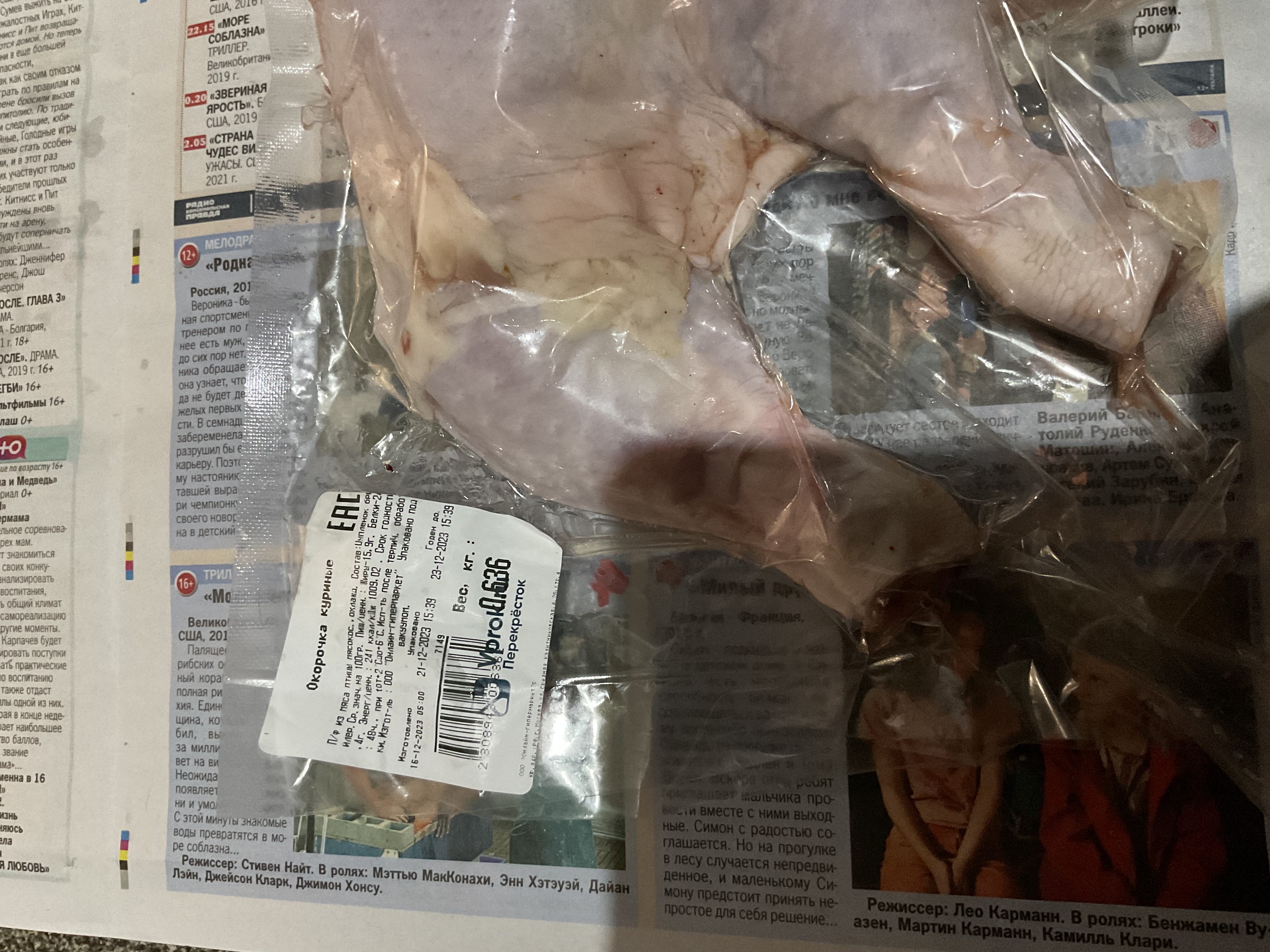 Но заинтересовало вот что, на постоянной основе заказываем охлажденку под маркой Перекресток: окорочка, грудки итп. Последнее время приходит упаковка с тремя сроками, допустим, изготовлено 16.12.23., упаковано 21.12.23, годен до 23.12.23. Такого точно раньше не было, во всяком случае на этикетке, кроме того в а карточке товара, информация о том, что разделывает в день заказа! Обратилась с вопросом, через приложение в комментах к заказу и непосредственно на почту с просьбой прокомментировать - реакции ноль!