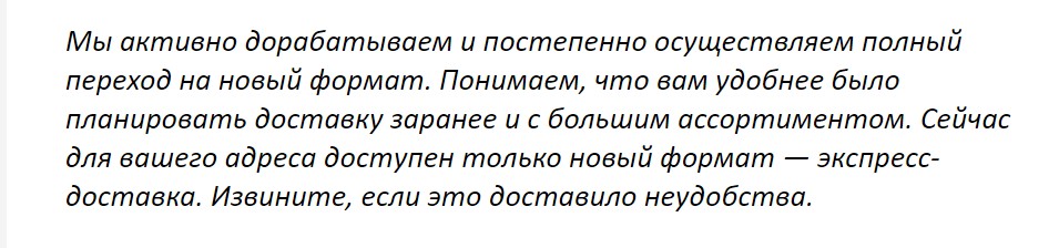 Мы обновили формат доставки - теперь все работает только в экспресс-режиме. Извините, если это доставило неудобства. Возвращение обычной доставки по вашему адресу на текущий момент не планируется.